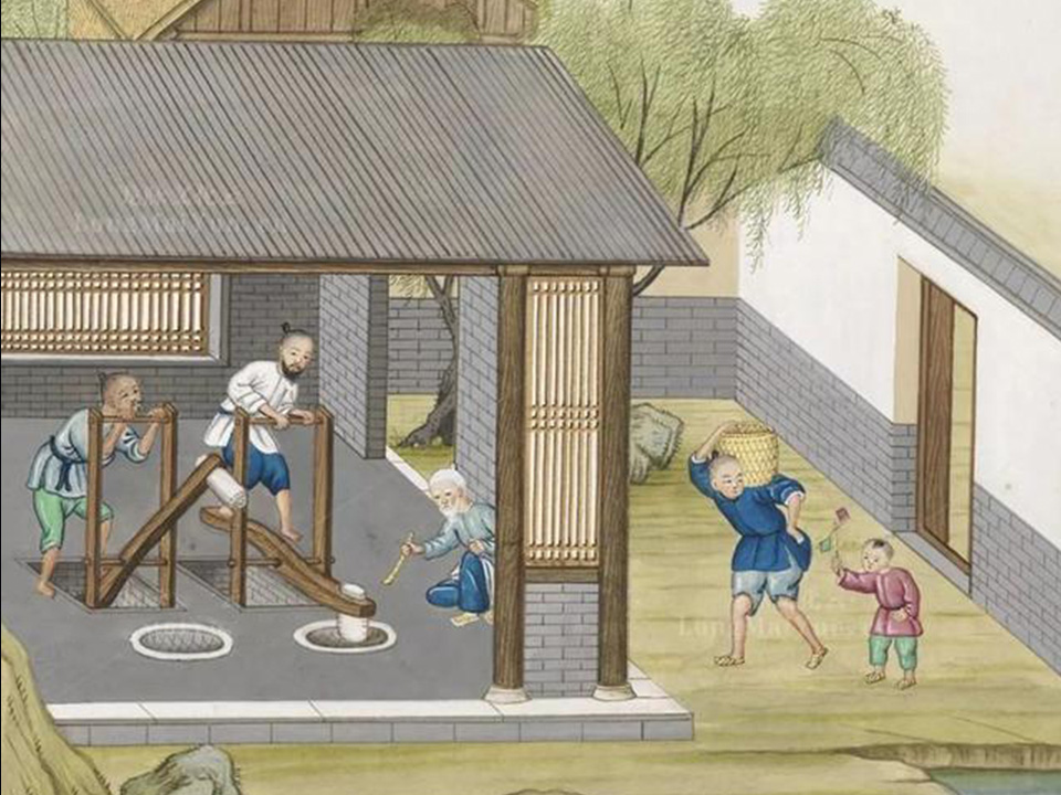 取出煮烂的原料放在石臼里用力舂成泥面状,捣烂后的原料